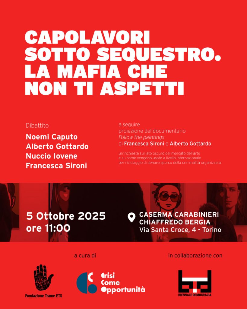 Un documentario, un dialogo aperto e un filo rosso che unisce la cultura alla responsabilità civile. Domenica 5 ottobre alle ore 11, presso la Caserma Carabinieri Chiaffredo Bergia (via Santa Croce 4, Torino), ospite di “Contro i luoghi comuni”, la terza edizione delle Giornate della legalità – Spazi aperti in luoghi chiusi, la Fondazione Trame, insieme a CCO – Crisi Come Opportunità e Biennale Democrazia presenta l’incontro “Capolavori sotto sequestro. La mafia che non ti aspetti”.